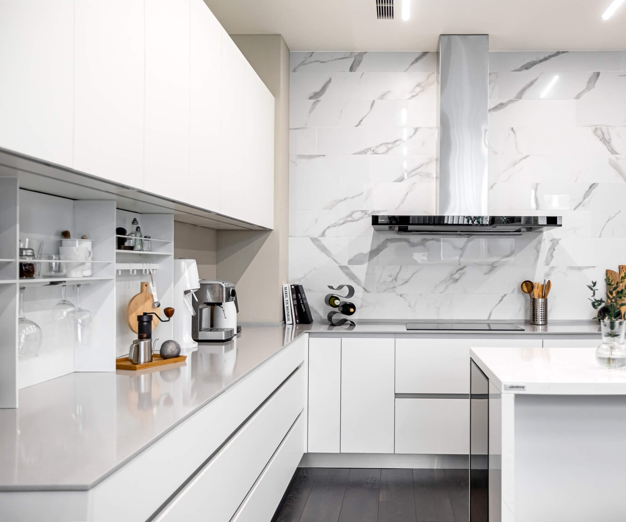 為達到客戶對質感的極致追求,檯面指定使用西班牙SILESTONE® 賽麗石,營造出大器優雅的視覺。為了體現極致的工藝細節,此案的牆面特別採用了日本 AICA 抗菌防火壁板,不僅美觀更易清潔。所有門板內,我們全線採用了德國GRASS 頂級靜音緩衝抽屜、德國 Hettich 頂級緩衝鉸鍊,確保每一次開合都靜謐無聲。吊櫃下方的崁入式 LED 線性照明,則為這個沉穩的空間,增添了輕盈的現代科技感。