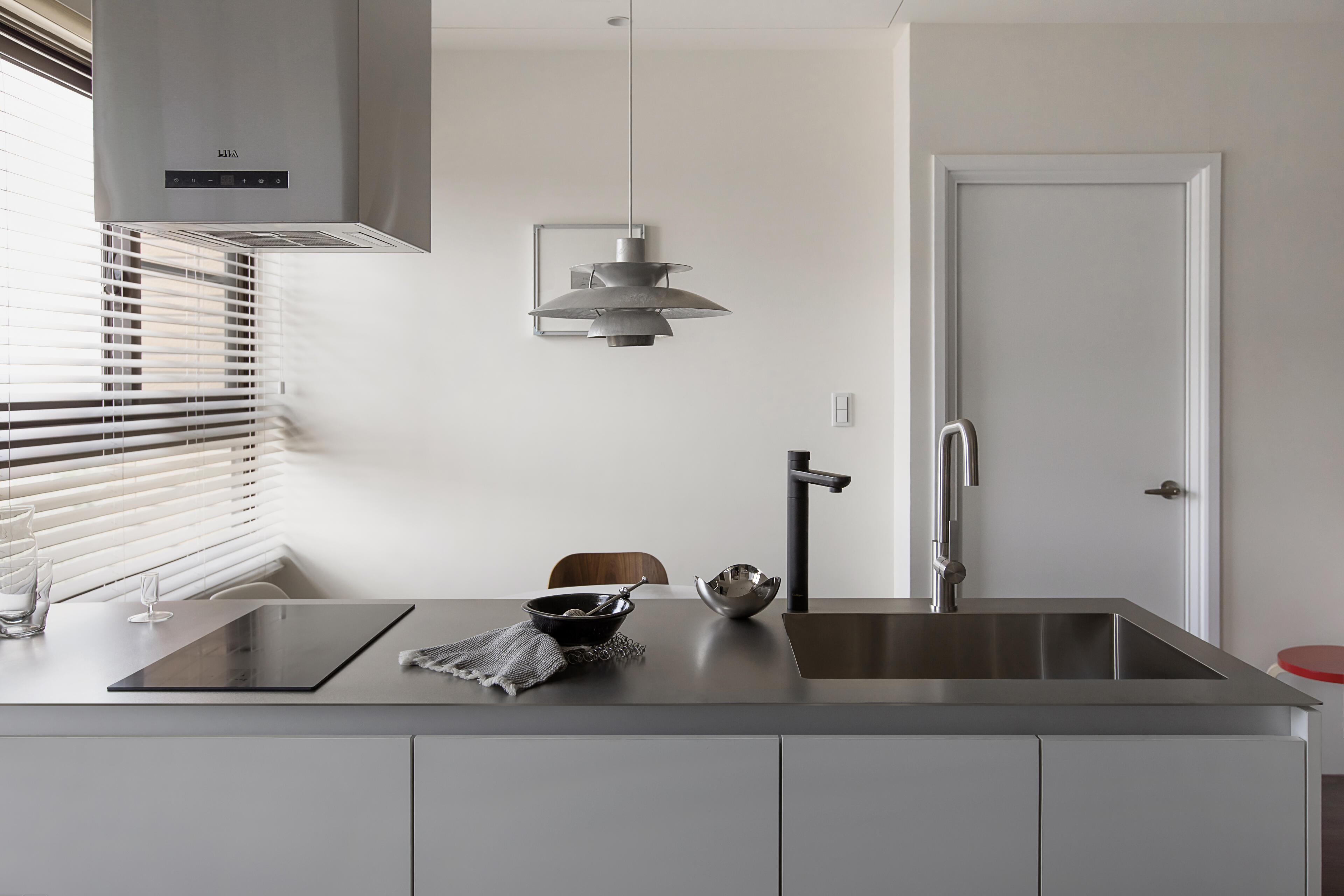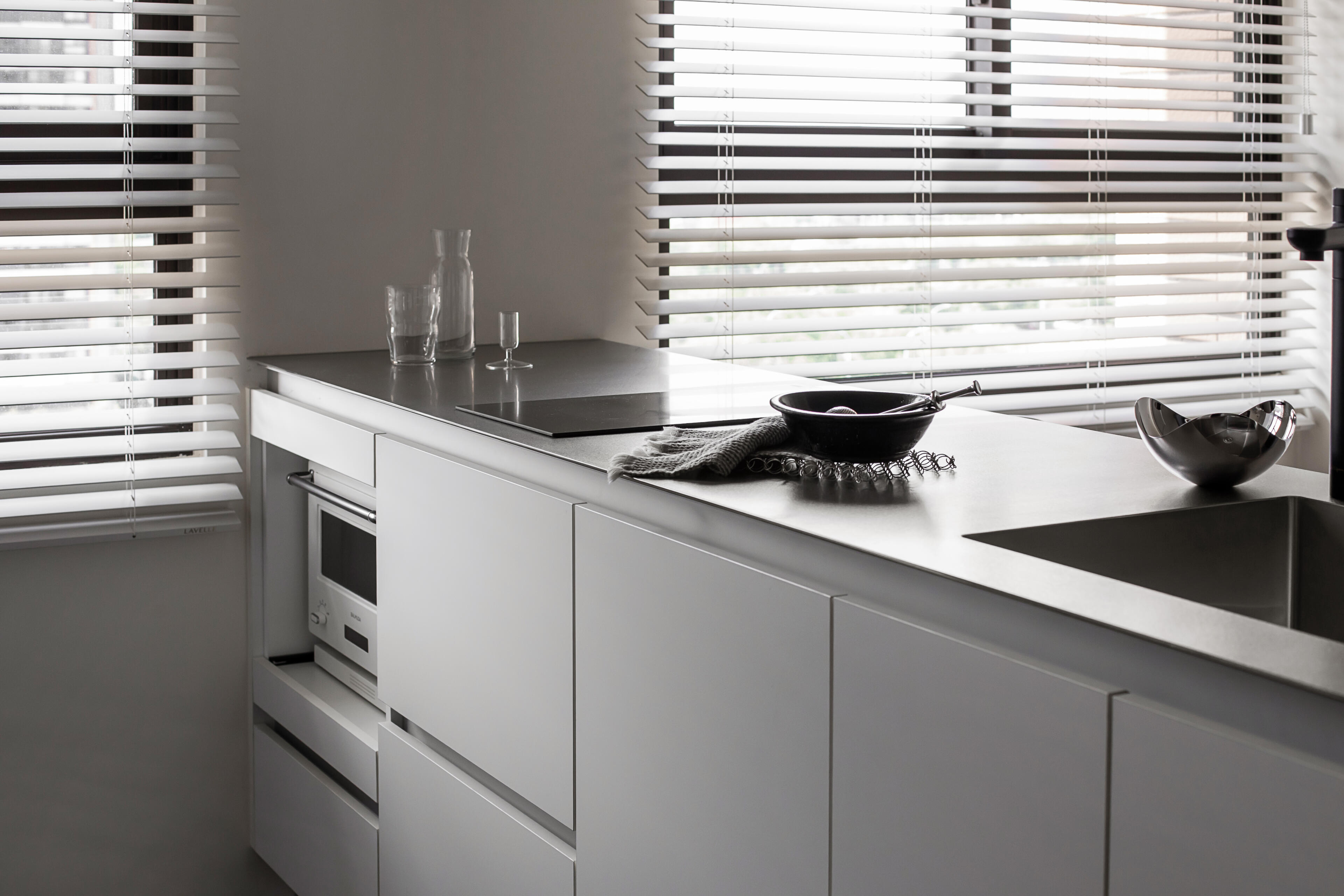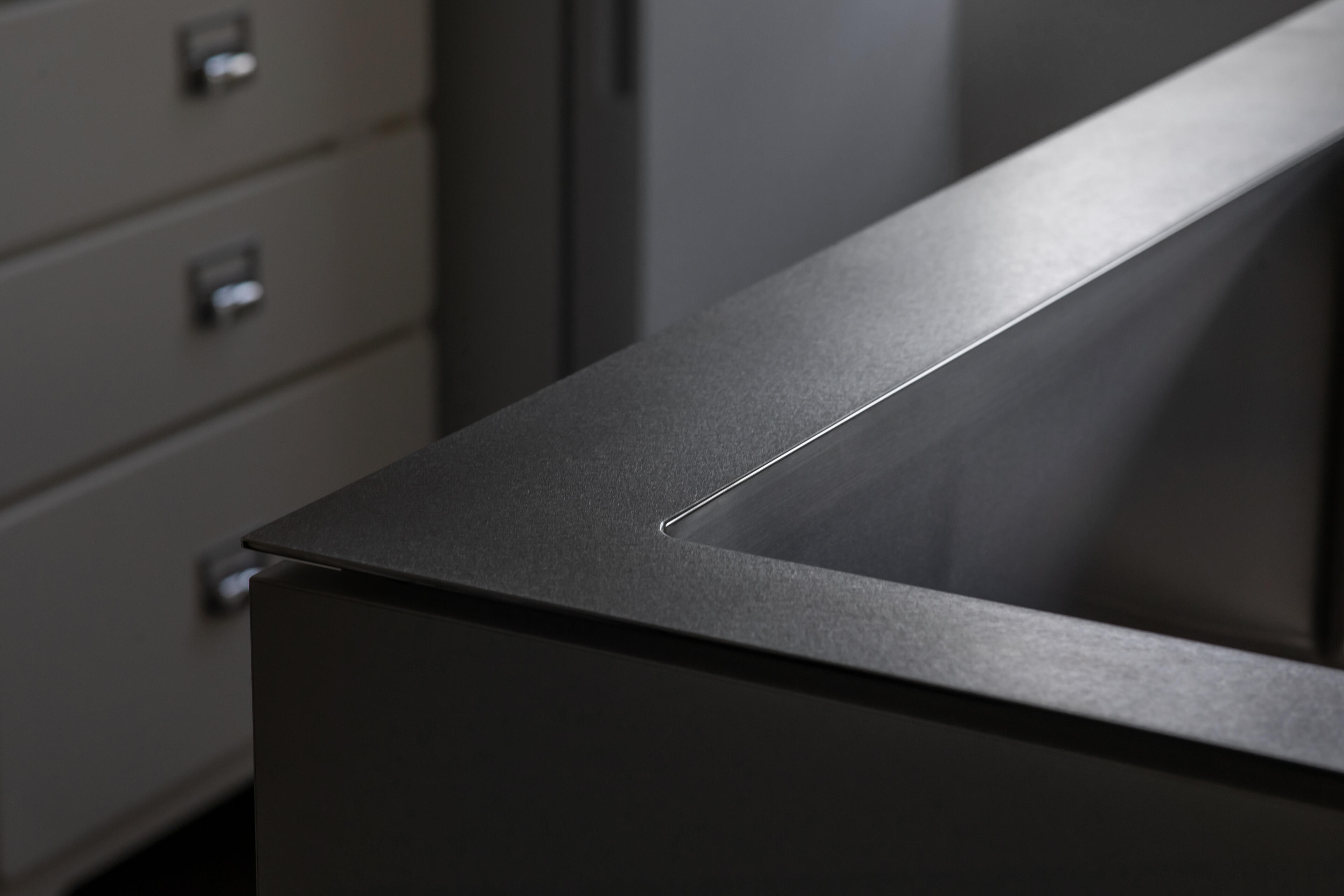 為達到客戶對質感的極致追求,檯面指定使用西班牙SILESTONE® 賽麗石,營造出大器優雅的視覺。為了體現極致的工藝細節,此案的牆面特別採用了日本 AICA 抗菌防火壁板,不僅美觀更易清潔。所有門板內,我們全線採用了德國GRASS 頂級靜音緩衝抽屜、德國 Hettich 頂級緩衝鉸鍊,確保每一次開合都靜謐無聲。吊櫃下方的崁入式 LED 線性照明,則為這個沉穩的空間,增添了輕盈的現代科技感。