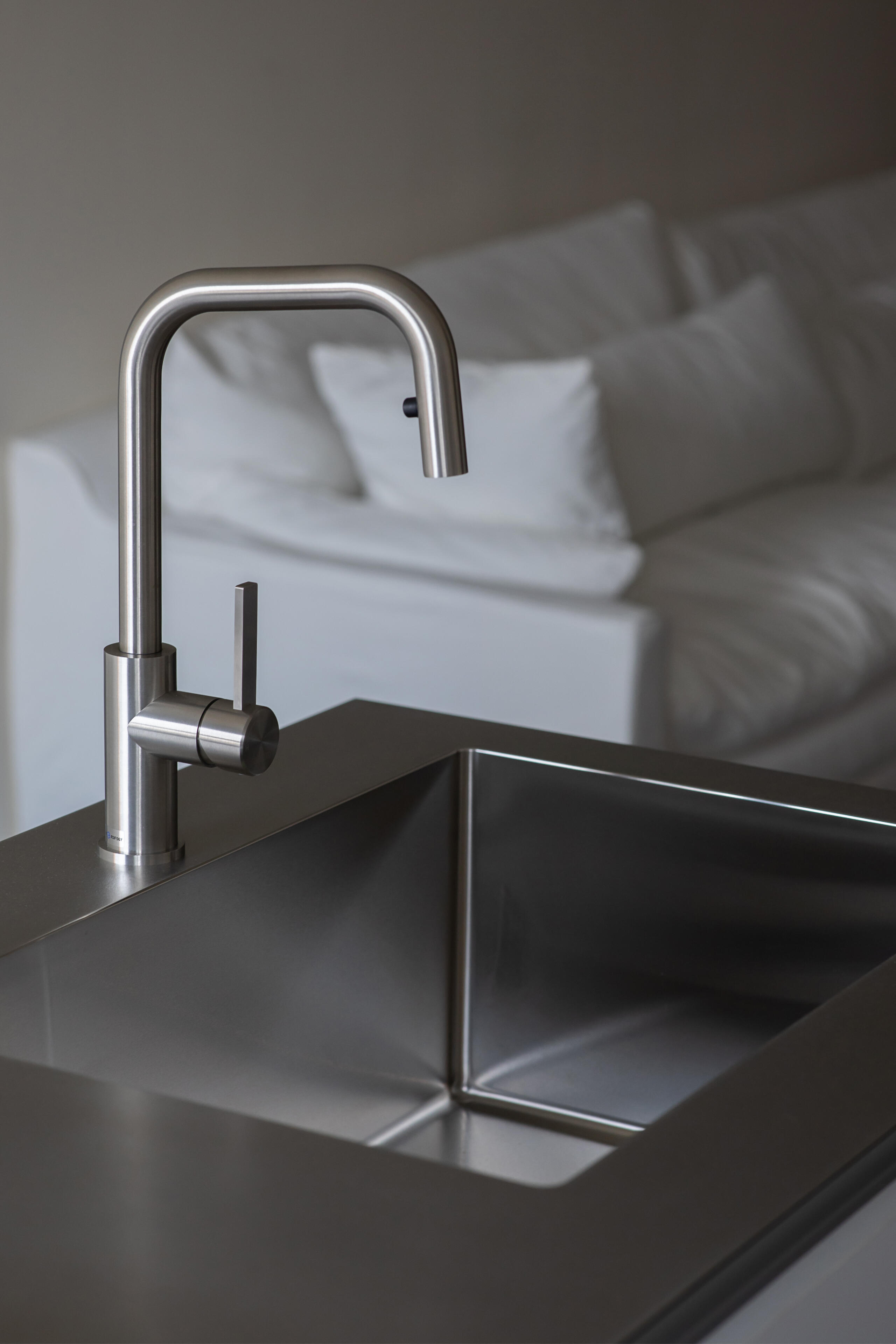 為達到客戶對質感的極致追求,檯面指定使用西班牙頂級 DEKTON® 帝通石,營造出大器優雅的視覺。為了在純白中創造亮點,我們特別選配了金色伸縮龍頭。而在簡潔的無把手門板之內,上櫃下方的崁入式 LED 線性照明,增添了輕盈的現代科技感。我們全線採用了德國GRASS 頂級靜音緩衝抽屜、德國 Hettich 頂級緩衝鉸鍊,確保每一次開關,都是未來二十年安靜滑順的承諾。