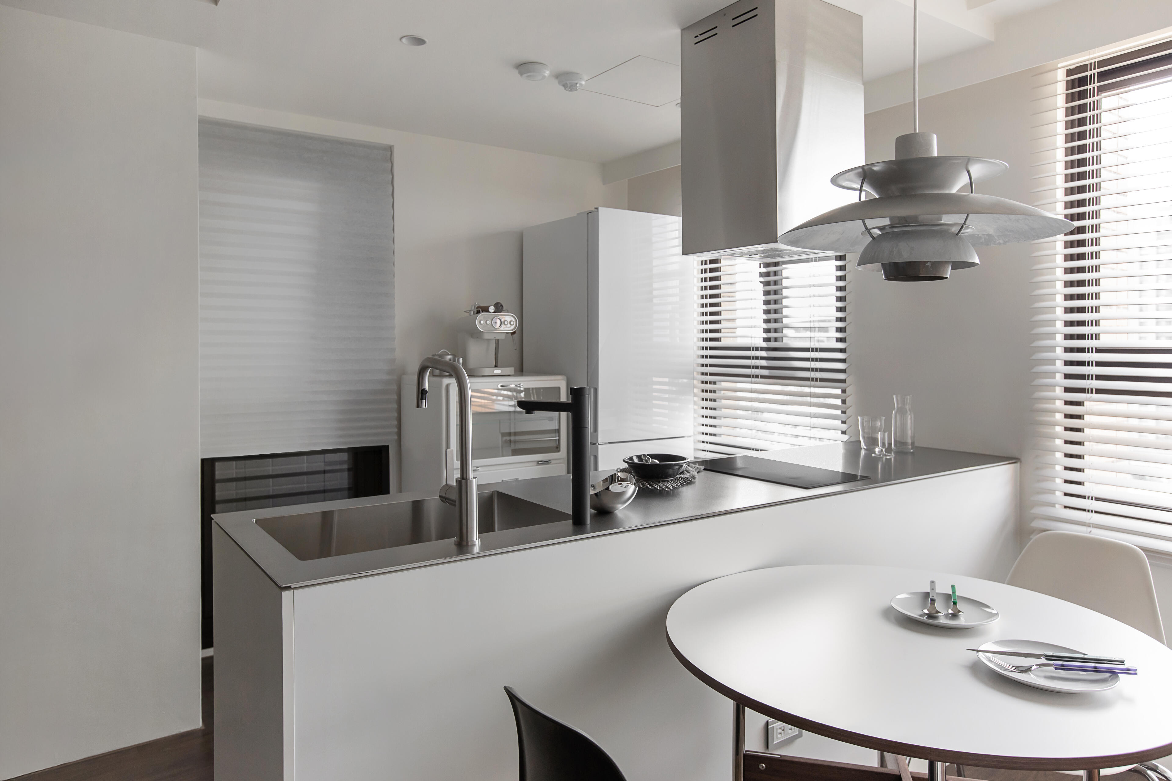 這是一次充滿火花與挑戰的深度合作。為了完美呈現心中的俐落輪廓,業主親自挑選了極具挑戰性的 3mm 厚實不鏽鋼檯面、升降式排油煙機與 IH 爐。我們接下了這份期許,耗費大量時間與各方廠商反覆溝通、鑽研創新施作工法。從設備的精準安裝到檯面收邊的細節,我們將純白無把手櫃體與冷冽的不鏽鋼完美揉合,突破了技術的極限。(3) 美好的過程與記憶點